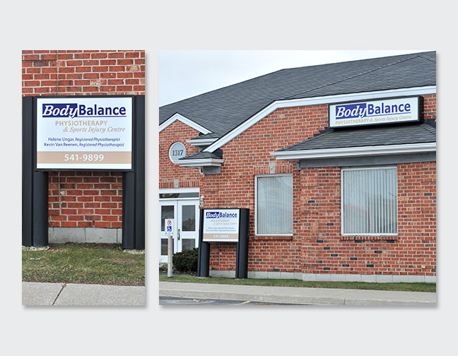 One-to-one care for Back, Neck, Joint and Muscle Pain, Sports Injury Management, Post-Operative Care, Outpatient Stroke Rehabilitation, Pre & Post-Natal Exercise Programs, Acquired Brain Injury Programs, and Registered Massage Therapy. Sign fabrication & installation by GeoPlast Signs.