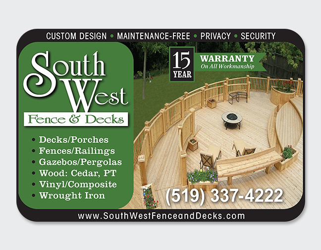 Since 1999, South West Fence & Decks has been providing their customers with products and all year round services of the highest standard. With hard work and a commitment to superior quality, their company has grown into a leader of innovative, custom, hand-crafted products, including decks & porches, fences, railings, sheds, gates, gazebos, and more. In addition, South West offers complete residential and commercial Grounds Maintenance services throughout the year not limited to lawn care and snow removal.
