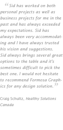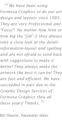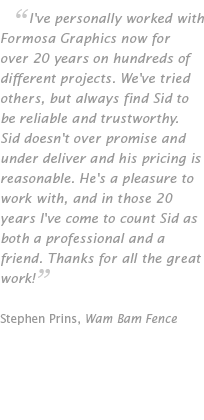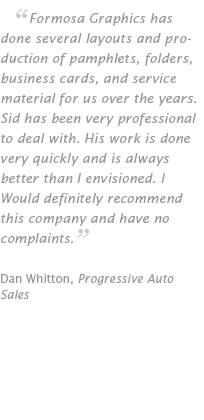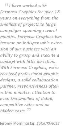 With a well-designed logo, business card and stationary package, FORMOSA GRAPHICS can help with the development of your Brand Identity, leading to brand loyalty, brand preference, high credibility, good prices and good financial returns.