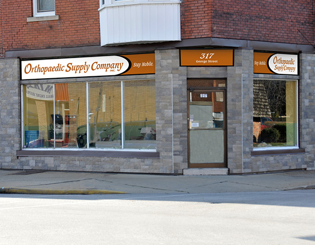 A full-service orthopeadic supply company offering Custom Osteoarthritis Knee Braces, Custom ACL & OTS Knee Braces, Ankle/Wrist/Thumb Braces, Compression Stockings, Competitive Pricing, and Senior's Discount — a Greenshield Provider. Sign fabrication & installation by GeoPlast Signs.