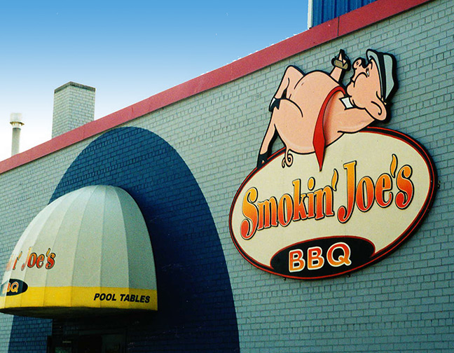 Originally established as a Sarnia restaurant in 1999, Smokin’ Joe’s has taken to the road to Ribfests across Ontario where they have been smokin’ up the competition winning first place awards for their fall-off-the-bone taste and goodness. Sign fabrication & installation by GeoPlast Signs.